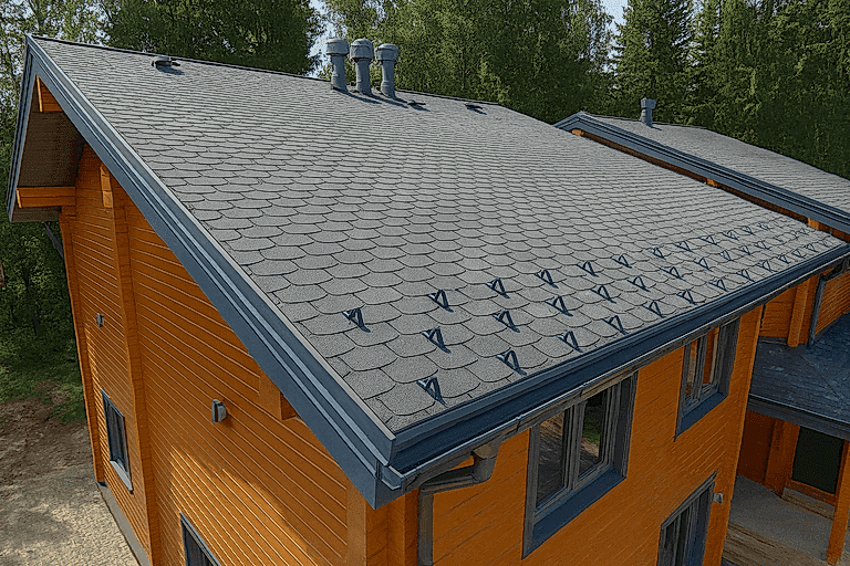 Строительство крыши из мягкой кровли под ключ включает проект, Pin-Up и монтаж; можно заказать и отдельные этапы.